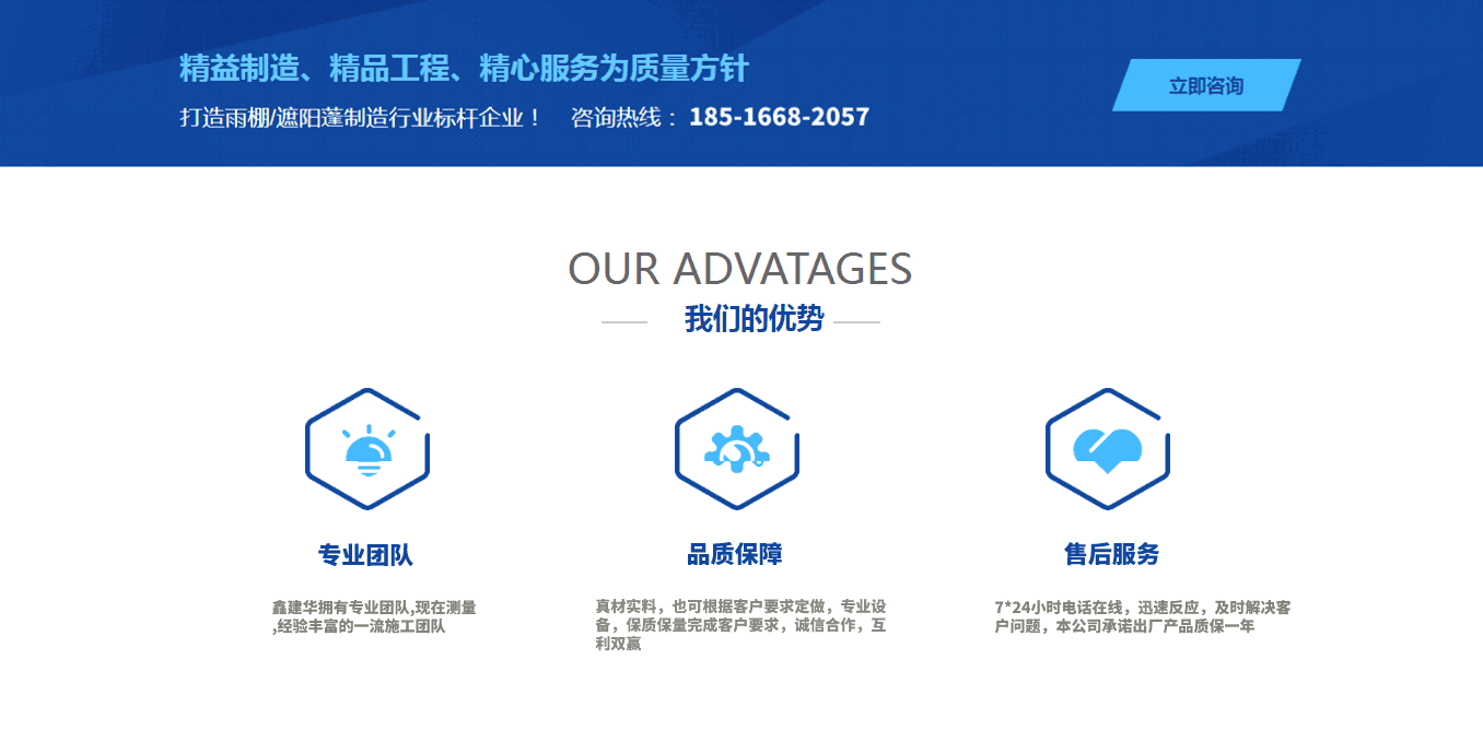 鑫建華雨棚有限公司成立于2012年,公司全體勵(lì)精圖治,飛速發(fā)展,已從初創(chuàng)業(yè)公司發(fā)展成為多元化公司,目前公司員工約1000余人,其中擁有中、高級(jí)專業(yè)技術(shù)人員100余人,形成以戶外制造產(chǎn)業(yè)為主,其他第三產(chǎn)業(yè)為輔的多元式經(jīng)營(yíng)模式,旗下設(shè)有鋼結(jié)構(gòu)公司,環(huán)保設(shè)備公司.其鋼結(jié)構(gòu)公司主要以研發(fā),設(shè)計(jì)、生產(chǎn)、營(yíng)銷、安裝、服務(wù)為一體的鋼結(jié)構(gòu)生產(chǎn)制造型企業(yè),環(huán)保設(shè)備公司主要以“綠色環(huán)保節(jié)能“為核心戰(zhàn)略品牌.公司相關(guān)資質(zhì)齊備,主營(yíng)業(yè)務(wù):定制各種推拉蓬、活動(dòng)雨棚、倉庫雨棚、智能電動(dòng)蓬、伸縮電動(dòng)噴漆房、懸空電動(dòng)雨棚等手動(dòng),遙控電動(dòng)一體,系列產(chǎn)品,公司總部位于中國(guó).江蘇,目前,公司年經(jīng)營(yíng)規(guī)模達(dá)8千萬以上,經(jīng)營(yíng)區(qū)減已輻射全國(guó)大部份省會(huì)城市,在雨棚領(lǐng)域展露崢嶸,“鑫建華品牌“已成為國(guó)內(nèi)雨棚,在全國(guó)市場(chǎng)的占有率及品牌均名列前茅. 公司在蘇州、天津、重慶、武漢、濟(jì)南、鄭州、江門、衡陽均設(shè)有工廠,覆蓋全國(guó)主要城市、八倉生產(chǎn)制作安裝售后、國(guó)內(nèi)訂單全國(guó)范圍可上門安裝服務(wù)、國(guó)外訂單可派工程師出國(guó)指導(dǎo)安裝....